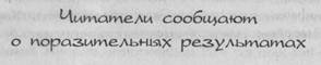 Конечно, книга Кэлдера не могла бы пользоваться таким громадным успехом, если бы не выполняла своего главного обещания: помочь читателю достичь омоложения, здоровья и жизненной силы. Естественно, это заключение подтверждается лавиной читательских писем, полученных редакцией за последние десять лет. В самых разных читательских отзывах, от самых скромных до наиболее чудесных, рассказывается о том, как помогли людям Пять Ритуалов.