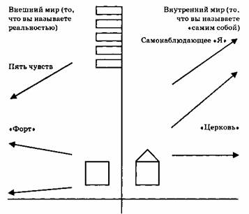 Относительно внутреннего мира Работа учит бороться со всем тем, что блокирует наш контакт с ним — ложная личность и так далее. Все ложное в нас образует, так сказать, толстое облако, которое препятствует правильному контакту с влияниями, приходящими к нам из внутреннего мира. Когда Работа формирует определенную точку или действующий «организм», то она начинает устанавливать связь с «внутренним миром». В данном случае я это называю «церковью». Это можно сравнить с тем, что мы должны сформировать в отношении внешней жизни, то есть с тем, что я называю здесь «фортом». Это было добавлено благодаря разговору, который произошел после того, как данный материал был зачитан на собрании в Бердлипе в прошлую субботу. Самое главное, нам нужно понять, что мы живем в двух разных реальностях или мирах: одном, который проводится чувствами; другом, который открывается только через работу над собой, через очищение эмоций от ложной личности и через правильную организацию ума посредством идей Работы, так что становится возможным относительное мышление и выстраивается правильная система мысли.