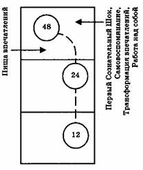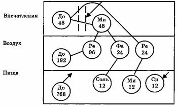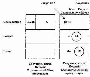 Точка, куда подается Первый Сознательный Шок, находится в том месте, где поступающие впечатления достигают сознания, когда До 48 входит в верхний этаж фабрики, и где, кроме того, присутствует Ми 48 из Октавы Воздуха. Октава Воздуха на стадии Ми 48 не может развиваться дальше к Фа 24, если не будет подан шок; а Октава Впечатлений, которая начинается с До 48 даже не начнет развиваться, если ее не активизирует шок. Шок, который требуется в этом месте в верхнем отделе, называется шоком Самовоспоминания. Но прежде чем идти дальше, мы должны совершенно четко усвоить, что этот шок не происходит механически, как это делает шок дыхания. Этот шок должен быть подан намеренно, через усилия определенного рода, связанные с пробуждением, и все эти усилия имеют общее название — Самовоспоминание. Если этот шок подан успешно, то Впечатления, поступающие в верхний этаж как До 48 и достигающие сознания, трансформируются в Ре 24 и затем в Ми 12. В то же время Октава Воздуха может перейти из Ми 48 в Фа 24 и затем в Соль 12. Таким образом, в результате Первого Сознательного Шока образуются дополнительные Водороды Ре 24, Ми 12, Фа 24 и Соль 12. Заметьте, что теперь на нижнем этаже есть три Водорода 12, тогда как раньше был только один, т.е. Си 12. Следующая диаграмма показывает, какие дополнительные энергии могут быть созданы в человеке, когда он начнет жить более сознательно, работать над собой и помнить себя — т.е. когда он начнет подвергать самого себя Первому Сознательному Шоку.