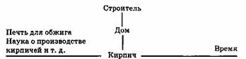 Если бы не было идеи строительства дома, то не было бы и кирпичей. Таким образом, в вертикальном смысле дом является причиной кирпича. Но во временном смысле (горизонтальном во Времени) причиной кирпича является печь для обжига. Все это можно представить следующим образом: