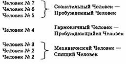 Мы таким же образом располагали типы Человека в вертикальном порядке: Сознательный Человек, Гармоничный Человек и Механический Человек. Сейчас я только хочу привлечь ваше внимание к этому соответствию между космосом Человека и космосом Клеток. Позже мы поговорим о космосе Атомов и об особых видах атомов. Я хочу подчеркнуть, что «что-то работает» в каждом космосе, или, если вам больше нравится другая формулировка, то, что существует в космосе Человека, должно соответствующим образом существовать в космосах под ним, потому что каждый космос подчиняется одним и тем же законам.