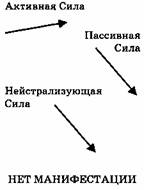 Эти три силы являются творческими только в точке их соединения, и именно здесь происходит манифестация, творение, событие. Из бесконечного числа вещей, которые могли произойти, появляются только несколько — именно тогда, когда эти три силы соединяются. Если они не встречаются все вместе, то ничего не происходит. К примеру, если встречаются Активная и Пассивная Сила, то ничего не происходит, нет никакого события. Но если появляется Нейтрализующая Сила, то будут работать все три силы, и что-то произойдет. В этом случае будет присутствовать триада — т.е. триада, составленная из трех сил, и когда бы эти три силы ни объединялись как триада, в результате всегда должна произойти манифестация. Каждая триада, каждое соединение трех сил, может произвести другую триаду, и при правильных условиях в результате появляется цепочка триад. Новая триада всегда возникает из Нейтрализующей Силы, т.е. из Третьей Силы.