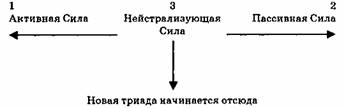 Бердлип, 25-е января 1942 г. ЗАКОН ТРЕХ (Часть I.)Часть I. —К каким конечным принципам, к каким законам может быть сведена Вселенная, все ее проявления и процессы? Согласно Учению этой Работы, за всеми вещами стоят конечные законы, которые называются соответственно Законом Трех и Законом Семи. Эти законы — основные. С точки зрения Учения Вселенная сотворена: мы живем, во-первых, в сотворенной Вселенной, а во-вторых, в упорядоченной Вселенной. Если бы Вселенная была хаосом, то не было бы порядка и законов. Космос буквально означает порядок как нечто, отличающееся от хаоса. Если бы мир был хаосом, то было бы невозможно изучать законы материи и т.д. Наука не могла бы существовать. Закон Трех — это Закон Трех Сил Творения. Этот закон устанавливает, что в каждое проявление должны войти три силы. Но управляется творение другим законом — Законом Семи или Законом Порядка Манифестации. Силы Творения не могли бы работать, если бы они не творили в соответствии с определенным порядком, и этот порядок проистекает из Закона Семи. Но в настоящий момент нам нужно поговорить только о Законе Трех. Каждое проявление (манифестация) во Вселенной — это результат комбинации трех сил. Эти силы называются: Активная Сила, Пассивная Сила и Нейтрализующая Сила. Активная Сила называется Первой Силой. Пассивная Сила называется Второй Силой. Нейтрализующая Сила называется Третьей Силой. Первую Силу можно определить как инициативную силу, Вторую — как силу сопротивления или реакции, а Третью — как уравновешивающий или соотносящий принцип, связующую силу, или точку приложения. Эти три силы существуют как в природе, так и в человеке. Они работают во всей Вселенной, на каждом уровне. Они являются силами творения. Ничто не может быть произведено без соединения этих сил. Соединение этих трех сил образует триаду. Одна триада создает другую триаду, как на вертикальной шкале, так и на горизонтальной шкале Времени. Во Времени, то, что мы называем цепочкой событий, является цепочкой триад. Любое проявление, любое творение является результатом встречи этих трех сил: Активной, Пассивной и Нейтрализующей. Активная сила, или Первая Сила, не может ничего создать сама по себе. Пассивная Сила, или Вторая Сила, также не может ничего создать сама по себе. И Нейтрализующая Сила не может ничего создать сама по себе. Точно так же не могут и любые две из этих трех сил создать манифестацию (проявление). Необходимо, чтобы встретились все три силы, и тогда может иметь место манифестация или творение. Это можно проиллюстрировать следующим образом.