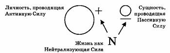 Считается, что Три Силы исходят из Единства. Это Единство обозначается термином Абсолют, что означает нечто безусловное и неограниченное каким бы то ни было образом, а, значит, не подчиняющееся никаким законам, кроме собственной воли. Поскольку Три Силы необходимы для любой манифестации, то Абсолют является Неманифестированным и Несотворенным. Абсолют непостижим для человеческой мысли. Творение нисходит по вертикали вниз во все возрастающую плотность законов, все дальше и дальше от Абсолюта. Как мы увидим, Земля находится на очень низком уровне Луча Творения по вертикальной шкале Вселенной. * * * Часть II. — Изменение в качестве нейтрализующей силы меняет не только отношения между силами в триаде, но может поменять местами Активную и Пассивную Силы. Когда жизнь является Нейтрализующей Силой, то в человеке активна личность и пассивна сущность.