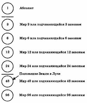 Процесс творения останавливается в Мире 96 по причине, которая будет объяснена позже, когда мы будем рассматривать Закон Семи или Закон Порядка Творения. Мир 96 в конце Луча Творения подчиняется 96 законам. Этот мир (или этот порядок миров) является самым удаленным от Абсолюта и подчиняется наибольшей плотности законов. Чем дальше удаляется процесс творения от Абсолюта, тем больше число законов. Необходимо понять, что творение обязательно предполагает законы, это вытекает из того факта, что три силы необходимы для любой манифестации. Без законов не может быть манифестации, и это означает, что любая сотворенная вещь неизбежно подчинена законам — т.е. ничто сотворенное не свободно. Теперь, если мы рассмотрим вертикальную линию Творения, то мы увидим, что если бы мы могли подниматься по ней, то мы подчинялись бы все меньшему числу законов — т.е. мы могли бы приобретать все больше свободы. В то же время, если нам приходится спускаться, то мы подчиняемся все большим ограничениям и становимся все менее свободными. Если создание, или существо, сотворено на уровне Мира 12, то оно подчиняется 12 законам или порядкам законов. Если оно падает до уровня Мира 48, то подчиняется 48 законам. Человек в своем теперешнем состоянии находится на определенном уровне Луча. Но он создан таким образом, что может изменять свой уровень в сторону повышения или понижения и, таким образом, подчиняться большему или меньшему числу законов.