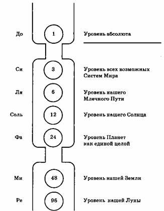 Луч Творения является нисходящей октавой До-Си-Ля-Соль-Фа-Ми-Ре, которая начинается вверху с ноты До на уровне Абсолюта и доходит внизу до ноты Ре на уровне Луны. Когда вы усвоите концепцию Водородов и уровней энергии, которые образуются в разных точках нисходящей шкалы творения, вы поймете, что эта октава не могла бы не быть нисходящей. Абсолют состоит из самой тонкой материи, которая только может существовать. Это высший уровень энергии. Более высокой и тонкой материи существовать не может, как не может быть и более тонкой или более всепроникающей энергии. Следовательно, акт творения не может иметь форму восходящей октавы, ибо это подразумевало бы создание все более тонких материй относительно той, что существует в отправной точке — т.е. Абсолют создавал бы тогда что-то более тонкое, чем он сам, а это невозможно. Но у человека есть возможность создавать более тонкие материи в себе. Он создан как саморазвивающееся существо. Это значит, что он может создавать что-то более тонкое, чем он сам, и таким образом подниматься по лестнице творения. Разговор о том, где он может создавать эти энергии, будет идти позже.