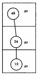 Бердлип, 27-е августа 1941 г. ИДЕЯ ТРАНСФОРМАЦИИ В РАБОТЕ (Часть III.)Часть III. — Чтобы продолжить этот разговор о Трансформации, позвольте мне задать следующий вопрос: «Что мешает впечатлениям трансформироваться в нас? Почему это не всегда случается?». Давайте еще раз рассмотрим этот вопрос. Впечатления должны двигаться по своей октаве, пока не достигнут Ми 12. Вы помните, что они поступают как До 48, но не развиваются дальше (см.: рисунок 1). Помните, что Первый Сознательный Шок должен заставить впечатления продолжать эволюционировать — т.е. трансформироваться в Водород 24 и потом в Водород 12. Таким образом, посредством Первого Сознательного Шока До 48 становится Ре 24 и потом Ми 12 (рисунок 2).